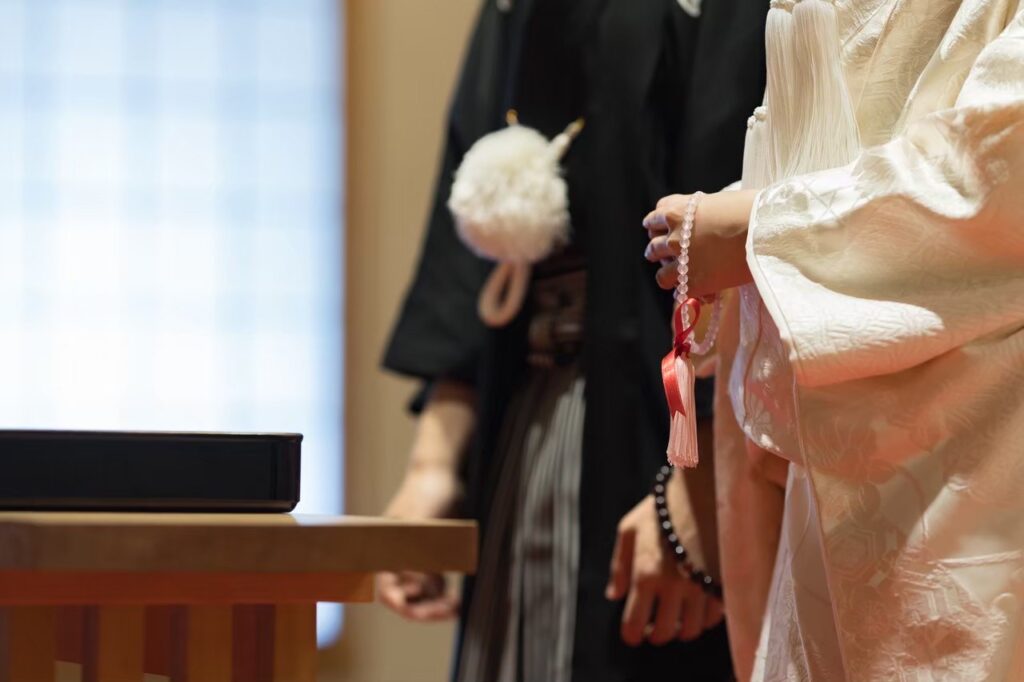 新郎新婦は式中に記念念珠をいただくことは可能だが、記念念珠をもらうまでの念珠が必要だ。